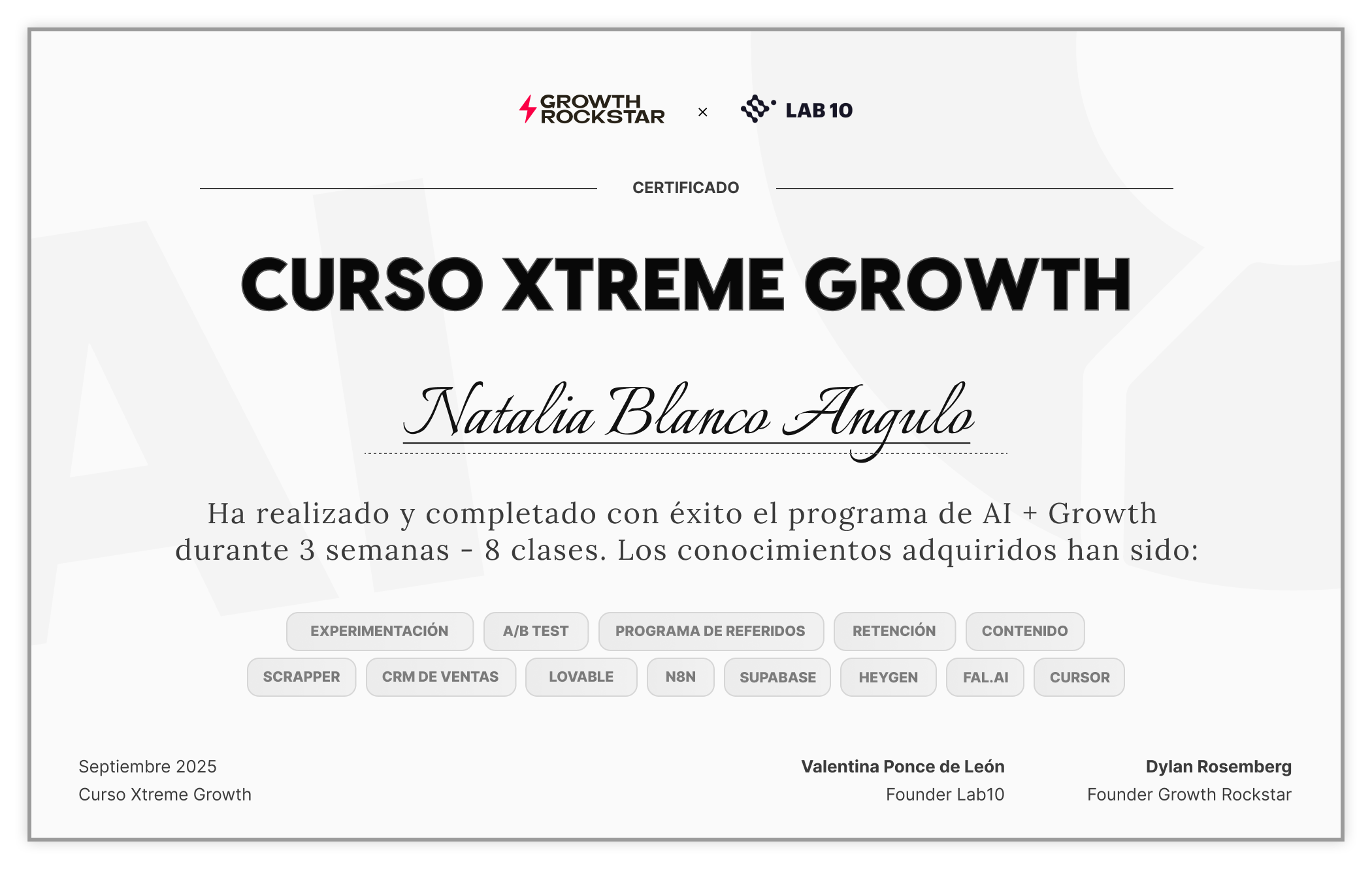 A lo largo de tres semanas de formación, Natalia Blanco Angulo ah completado el curso de Xtreme me Growth, desarrollando las habilidades necesarias para acelerar el crecimiento de productos y negocios a través estrategias de Growth con Inteligencia Artificial como: Experimentación, A/B Test, Programa de Referidos, Retención, Contenido, Scrapper, CRM de Ventas. Mediante herramientas como: Lovable, N8N, Supasbase, Heygen, Fal.AI, Cursor.