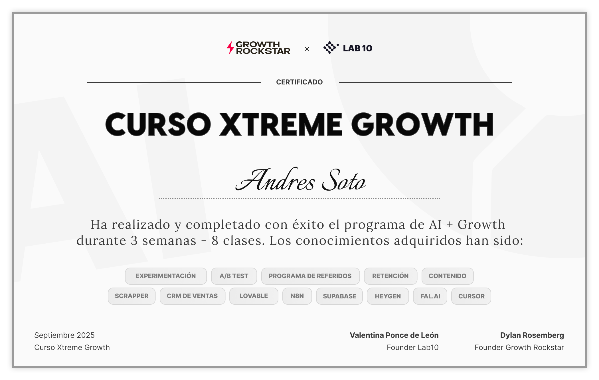 Esta página web es válida como certificado de que Andres Soto ha completado el Curso Product Rockstar®