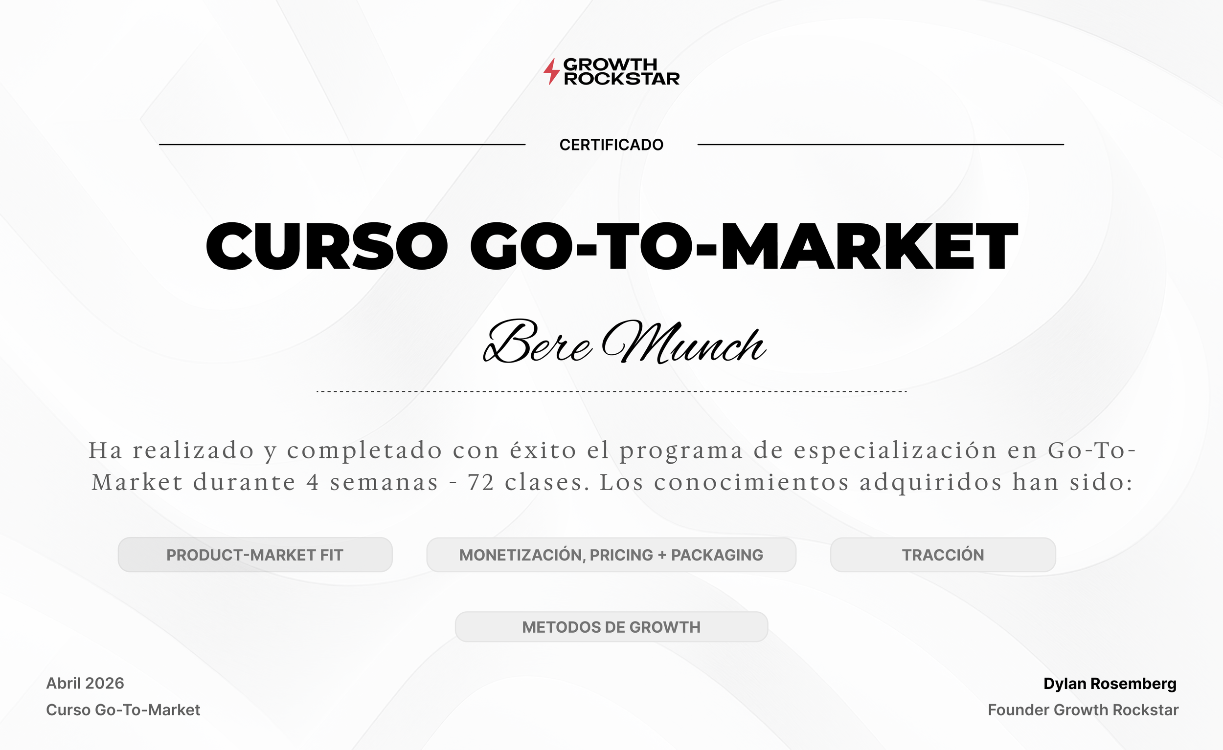 A lo largo de cuatro semanas de formación, Bere Munch ha completado el Curso Go-To-Market, apendiendo a generar tracción con estrategias probadas de: Product-Market Fit, Monetización, Pricing + Packaging, Tracción y Métodos de Growth.