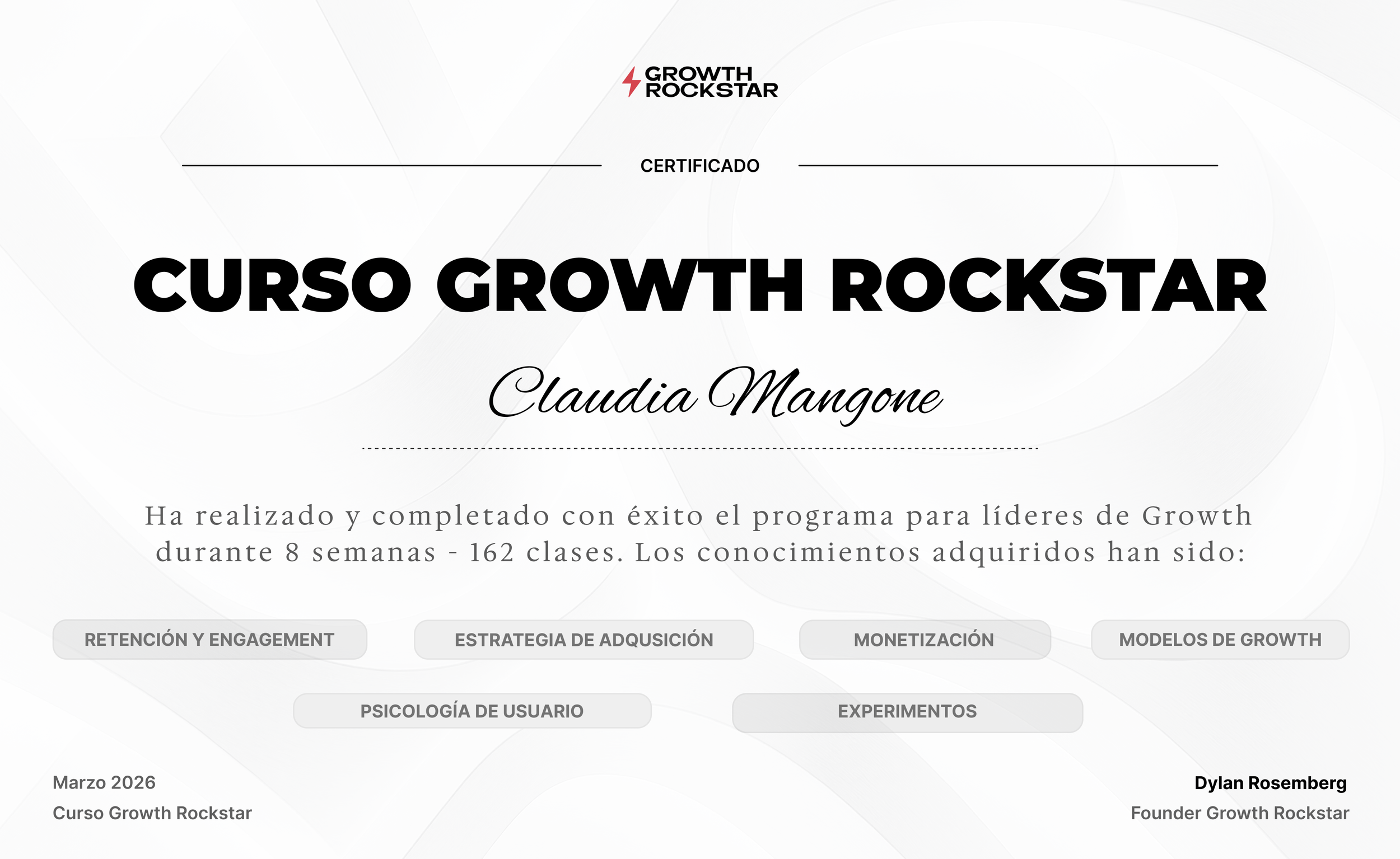 A lo largo de ocho semanas de formación, Claudia Mangone ha completado el Curso Growth Rockstar, aprendiendo a construir un sistema de Growth con estrategias probadas de: Retención + Engagement, Adquisición, Monetización, Experimentación, Psicología de Usuario & Modelos de Growth.