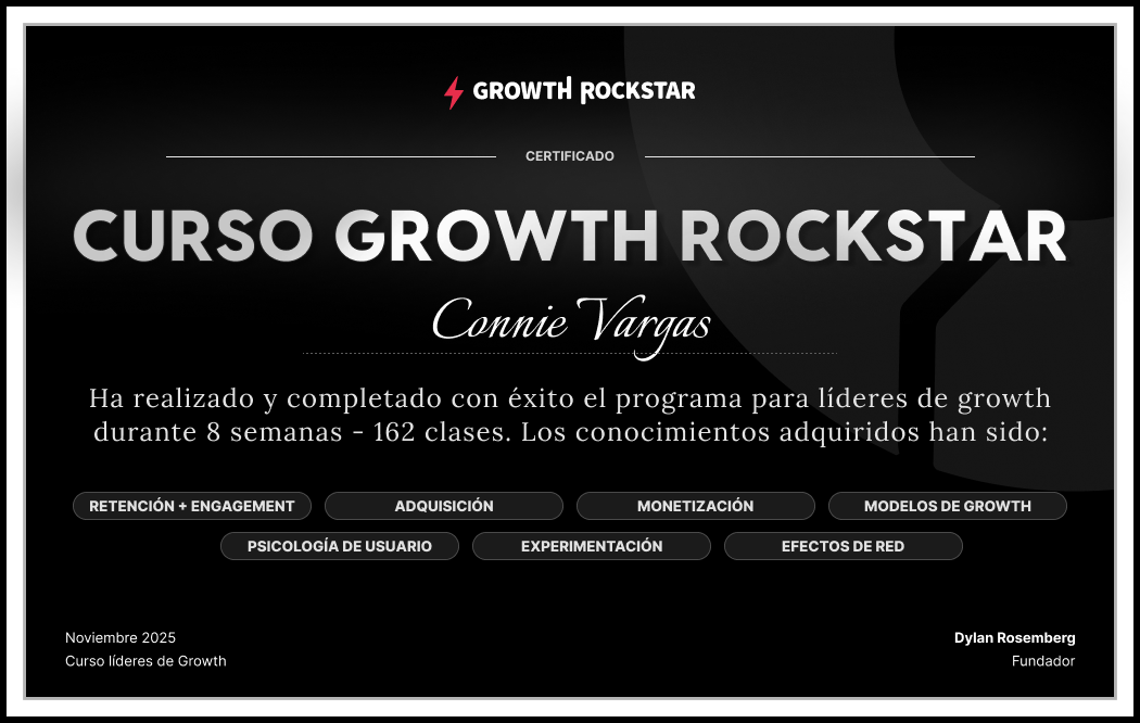Esta página web es válida como certificado de que Connie Vargas ha completado el Curso de Growth de Growth Rockstar®