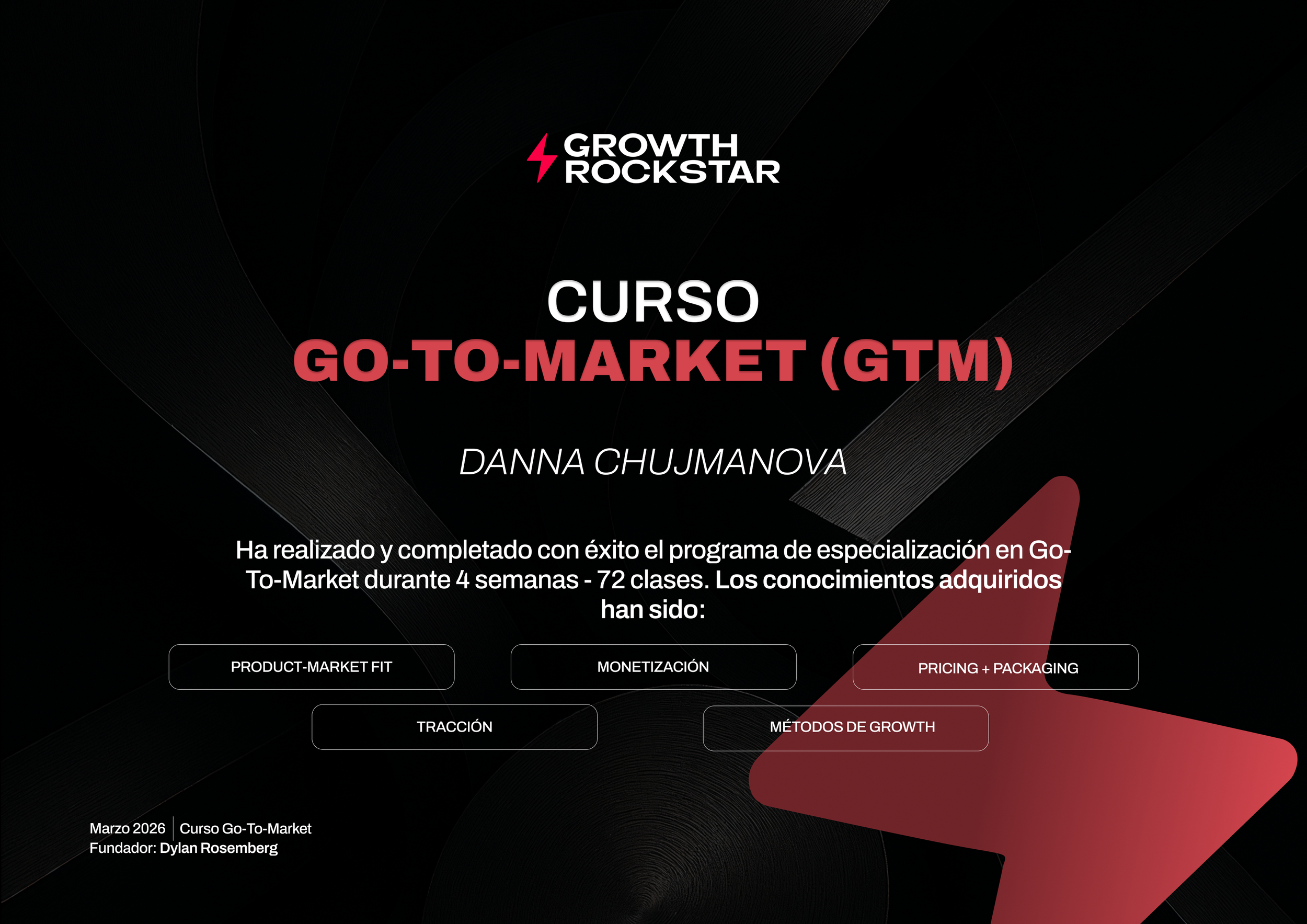 A lo largo de cuatro semanas de formación, Danna Chujmanova ha completado el Curso Go-To-Market, apendiendo a generar tracción con estrategias probadas de: Product-Market Fit, Monetización, Pricing + Packaging, Tracción y Métodos de Growth.