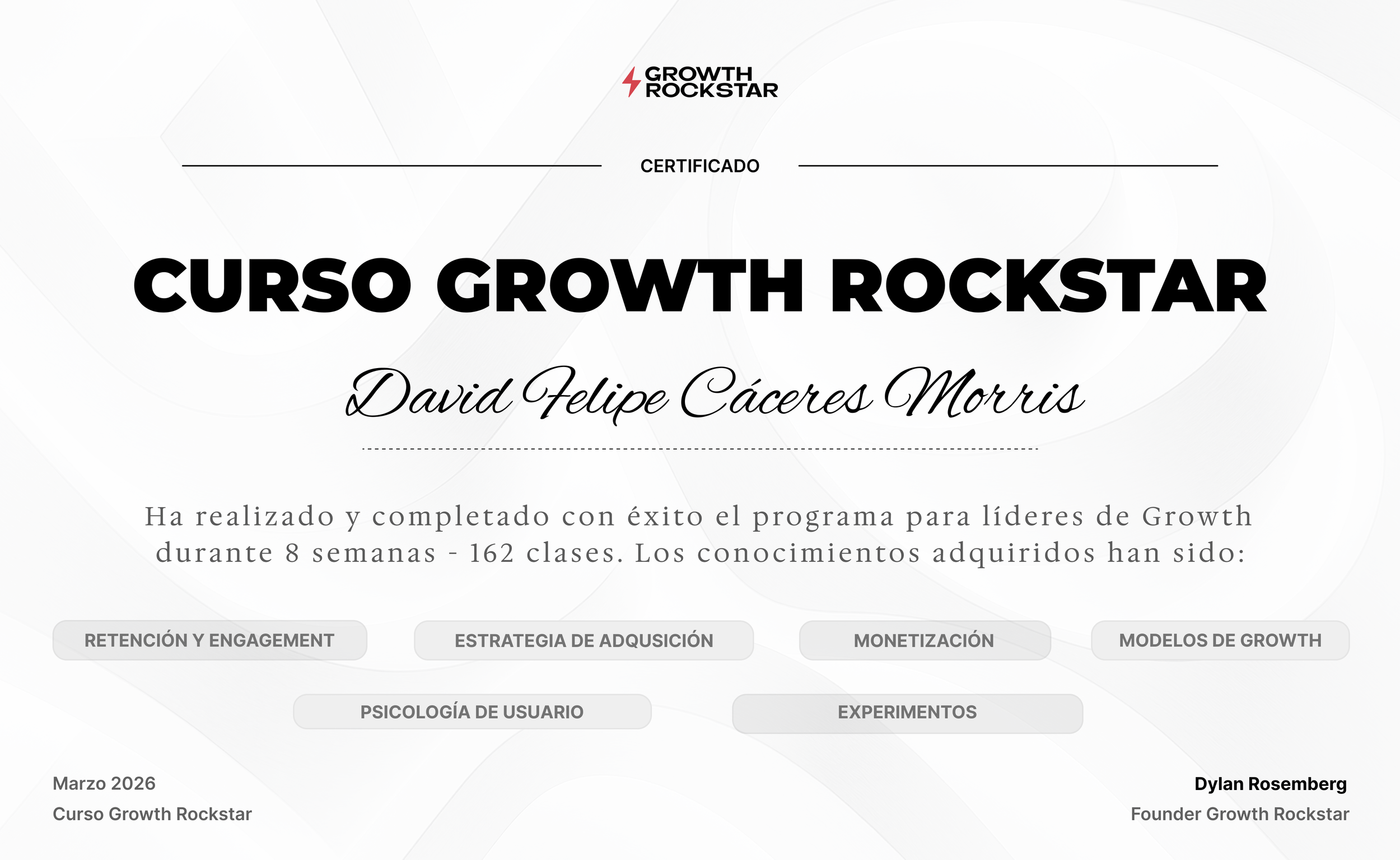A lo largo de ocho semanas de formación, David Felipe Cáceres Morris ha completado el Curso Growth Rockstar, aprendiendo a construir un sistema de Growth con estrategias probadas de: Retención + Engagement, Adquisición, Monetización, Experimentación, Psicología de Usuario & Modelos de Growth.