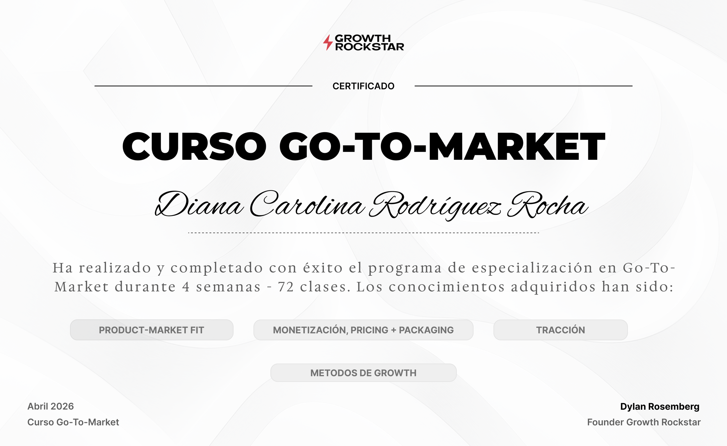 A lo largo de cuatro semanas de formación, Diana Carolina Rodríguez Rocha ha completado el Curso Go-To-Market, apendiendo a generar tracción con estrategias probadas de: Product-Market Fit, Monetización, Pricing + Packaging, Tracción y Métodos de Growth.