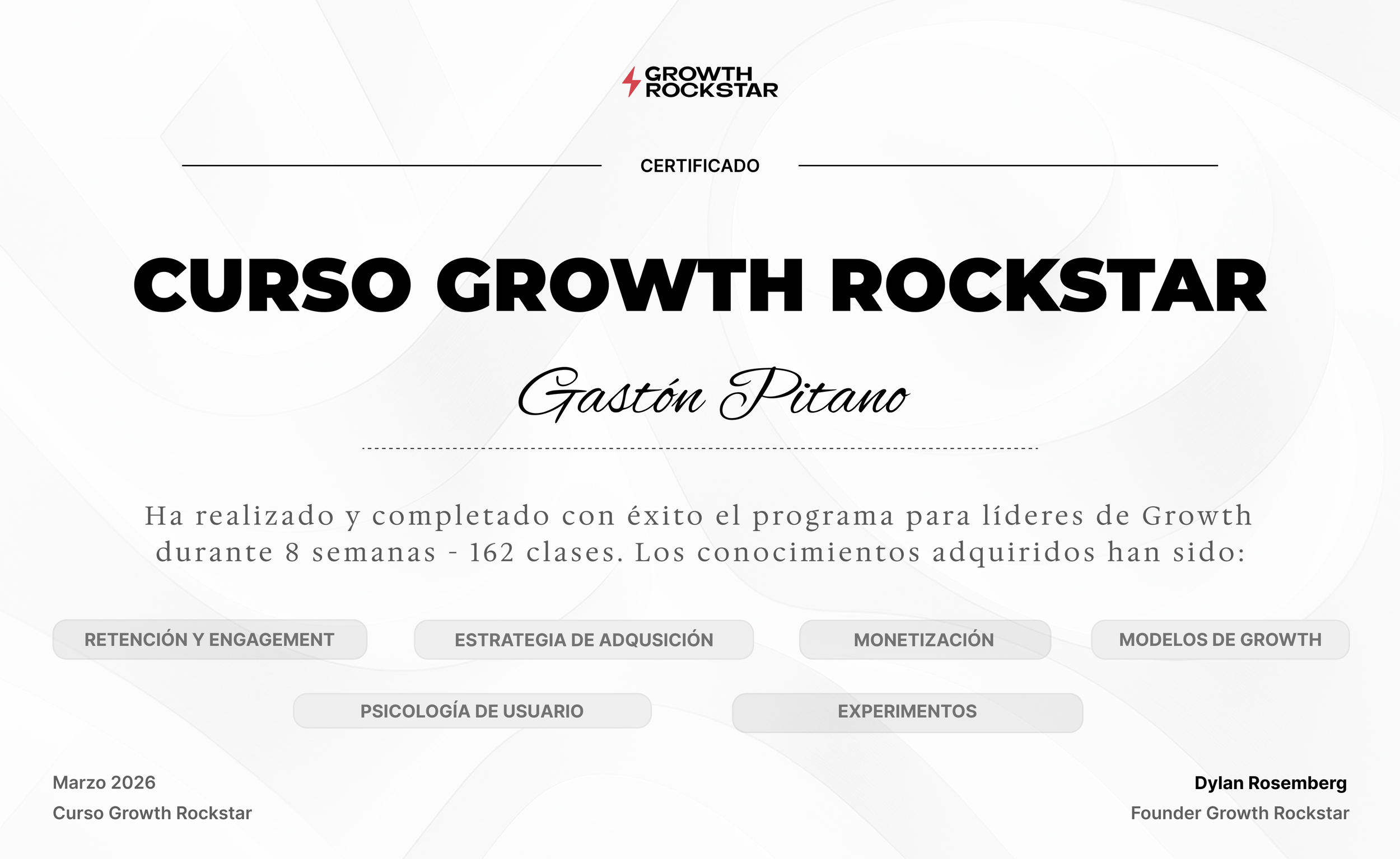 A lo largo de ocho semanas de formación, Gastón Pitano ha completado el Curso Growth Rockstar, aprendiendo a construir un sistema de Growth con estrategias probadas de: Retención + Engagement, Adquisición, Monetización, Experimentación, Psicología de Usuario & Modelos de Growth.