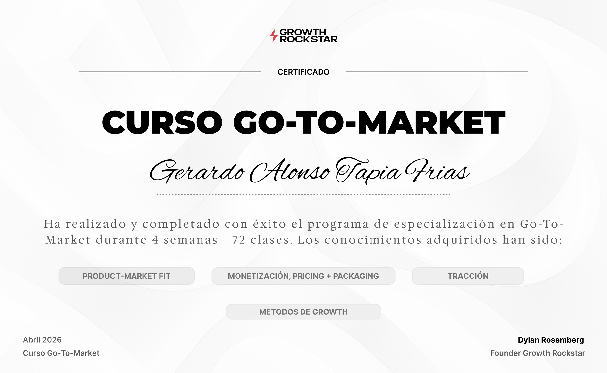 A lo largo de cuatro semanas de formación, Gerardo Alonso Tapia Frias ha completado el Curso Go-To-Market, apendiendo a generar tracción con estrategias probadas de: Product-Market Fit, Monetización, Pricing + Packaging, Tracción y Métodos de Growth.