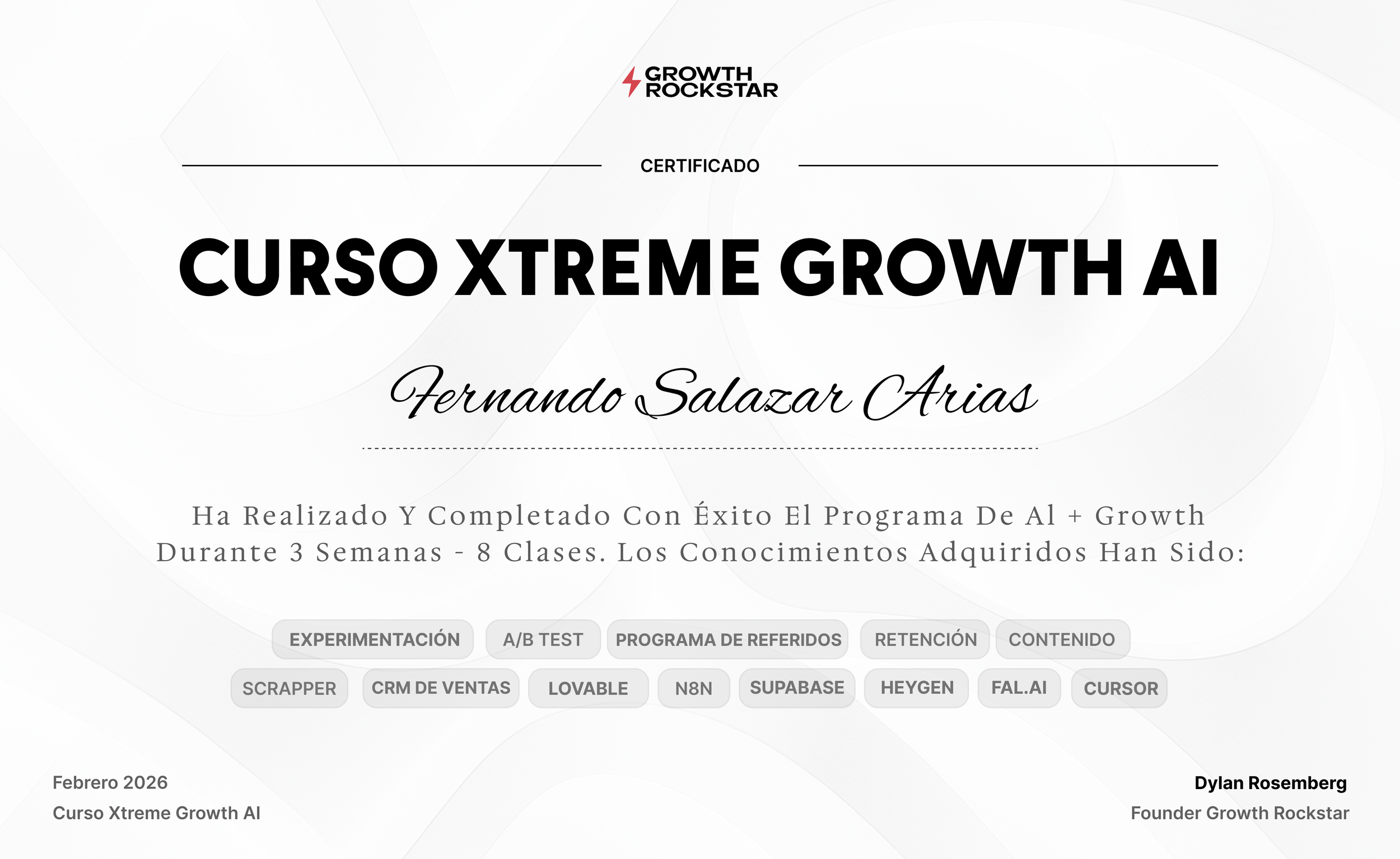 A lo largo de tres semanas de formación, Fernando Salazar Arias ha completado el curso de Xtreme Growth AI, desarrollando las habilidades necesarias para acelerar el crecimiento de productos y negocios a través estrategias de Growth con Inteligencia Artificial.