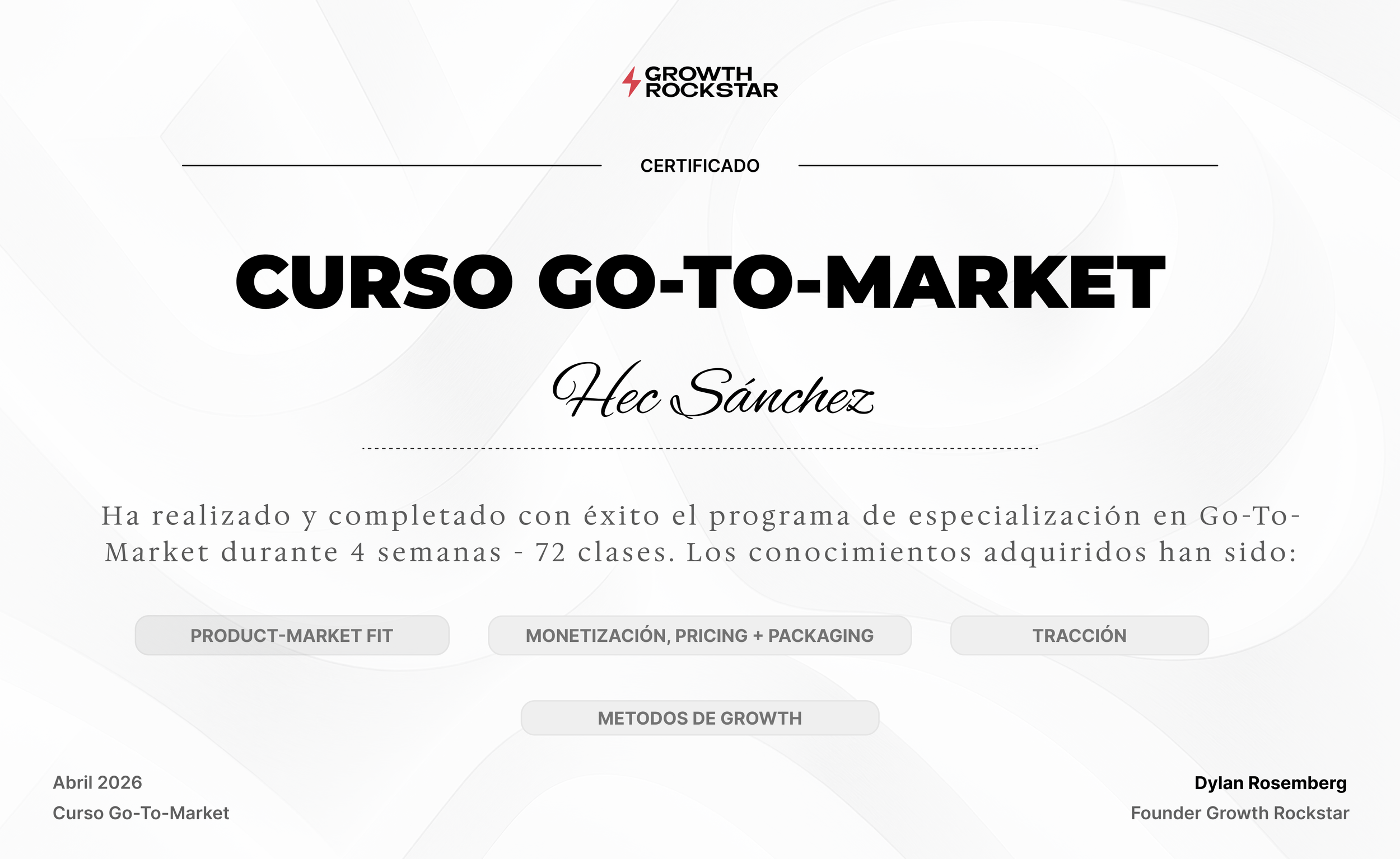 A lo largo de cuatro semanas de formación, Hec Sánchez ha completado el Curso Go-To-Market, apendiendo a generar tracción con estrategias probadas de: Product-Market Fit, Monetización, Pricing + Packaging, Tracción y Métodos de Growth.