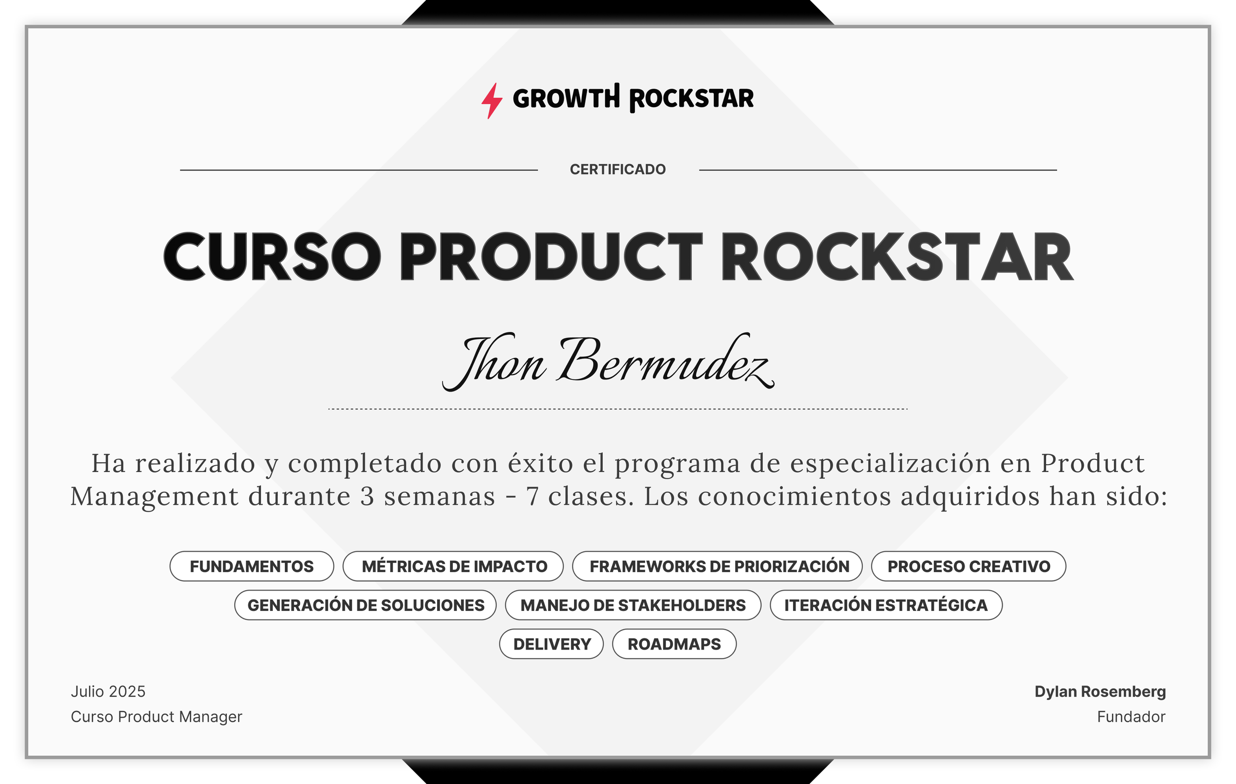 A lo largo de tres semanas de formación, Jhon Bermudez ha completado el Curso Product Rockstar, aprendiendo a liderar el desarrollo de productos con herramientas y estrategias clave como: Fundamentos de Producto, Métricas de Impacto, Frameworks de Priorización, Proceso Creativo, Generación de Soluciones, Manejo de Stakeholders, Iteración Estratégica, Delivery y Roadmaps.