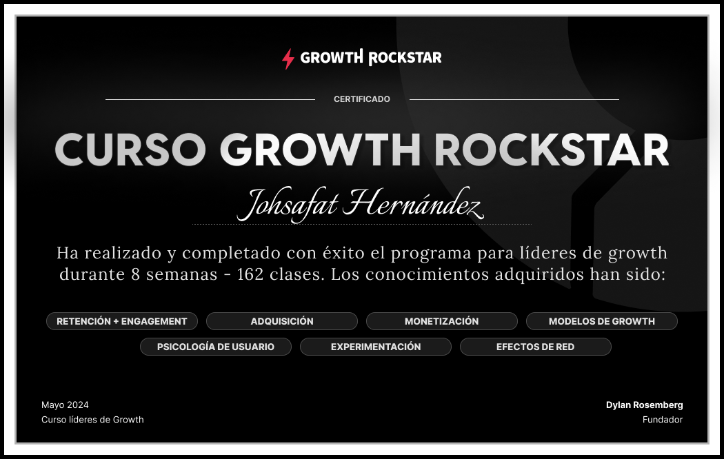Esta página web es válida como certificado de que Johsafat Hernández ha completado el Curso de Growth de Growth Rockstar®