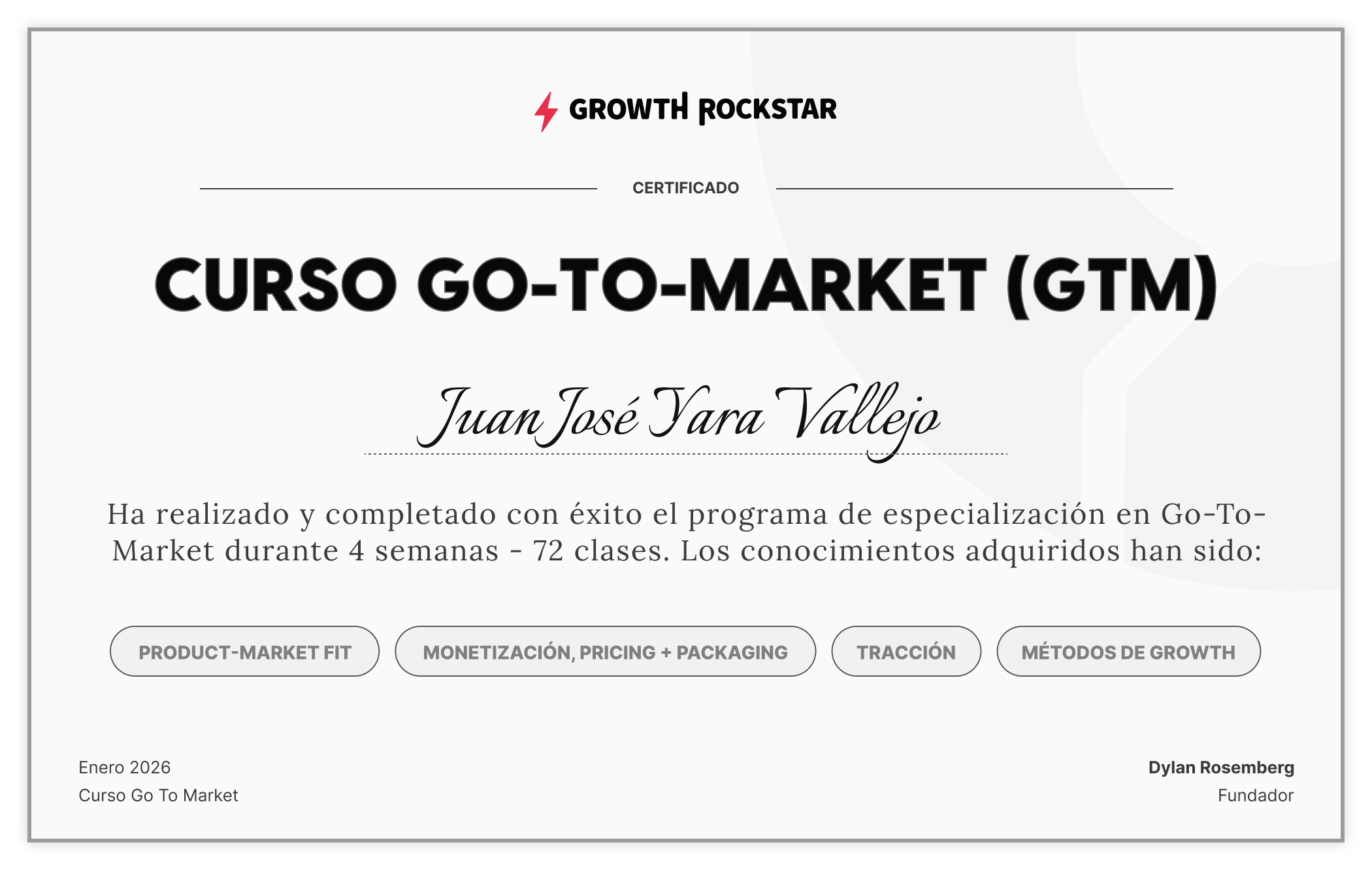 A lo largo de cuatro semanas de formación, Juan José Yara Vallejo ha completado el Curso Go-To-Market, apendiendo a generar tracción con estrategias probadas de: Product-Market Fit, Monetización, Pricing + Packaging, Tracción y Métodos de Growth.