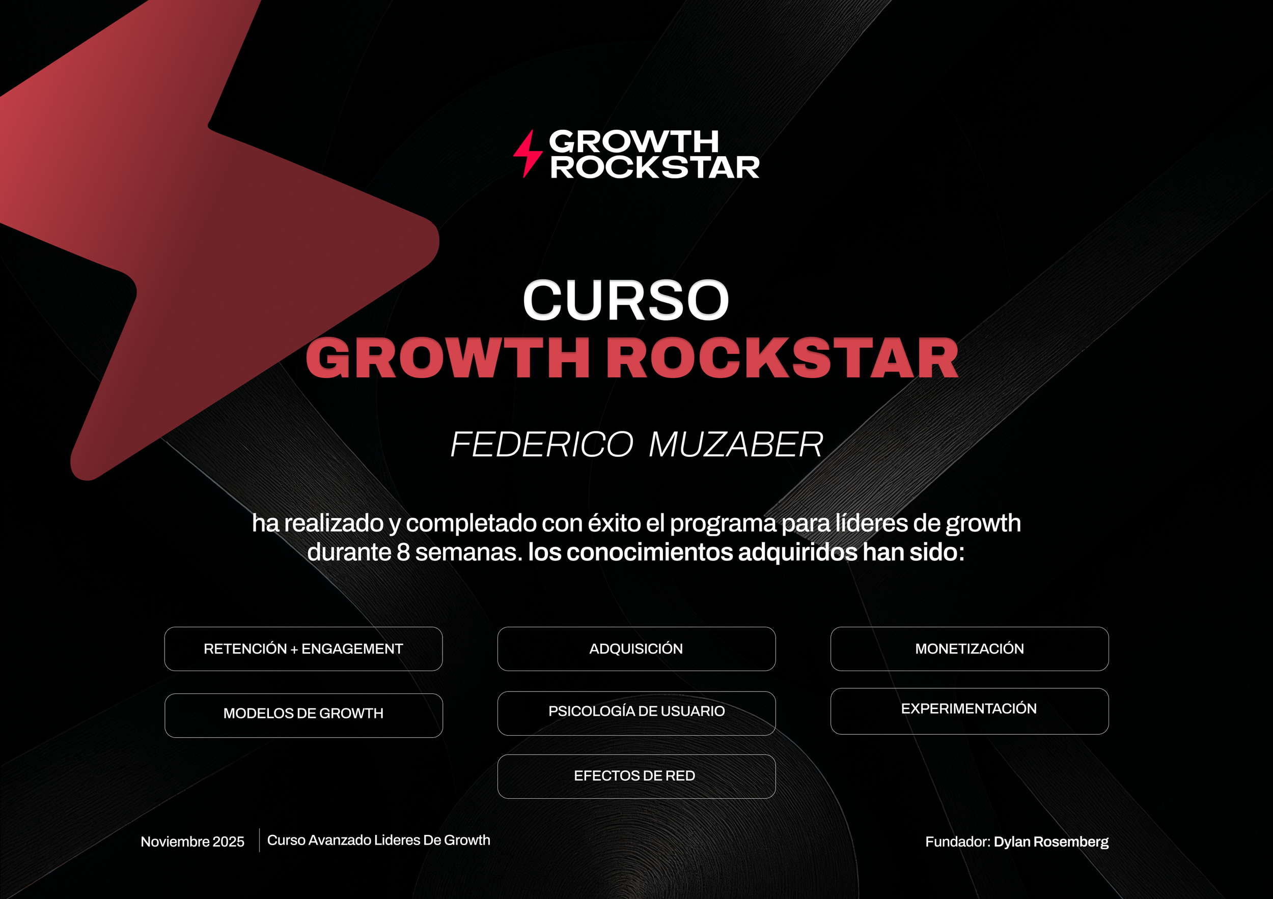 A lo largo de ocho semanas de formación, Federico Muzaber ha completado el Curso Growth Rockstar, aprendiendo a construir un sistema de Growth con estrategias probadas de: Retención + Engagement, Adquisición, Monetización, Experimentación, Psicología de Usuario & Modelos de Growth.