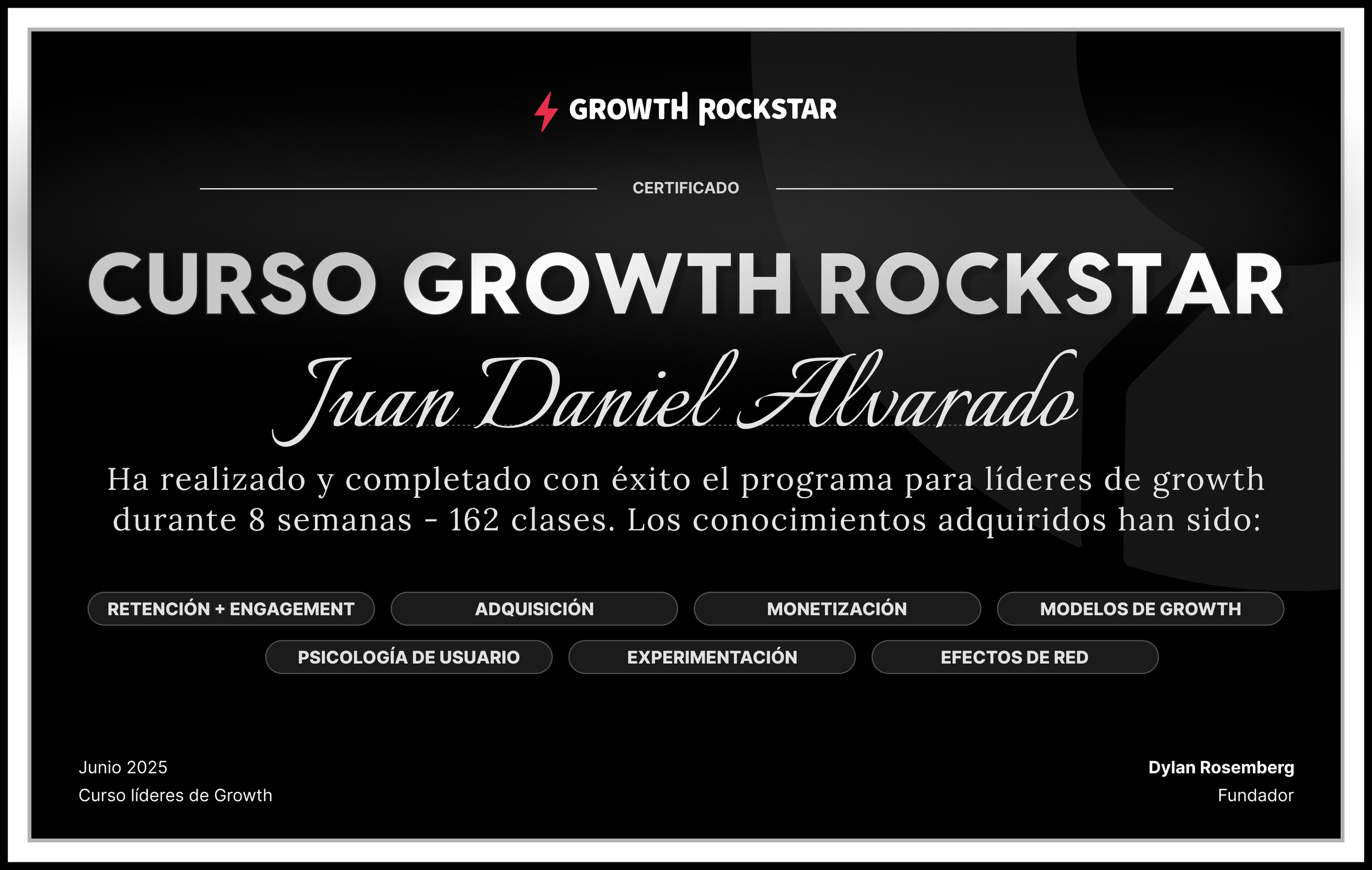 Esta página web es válida como certificado de que Juan Daniel Alvarado no ha completado el Curso de Growth de Growth Rockstar®