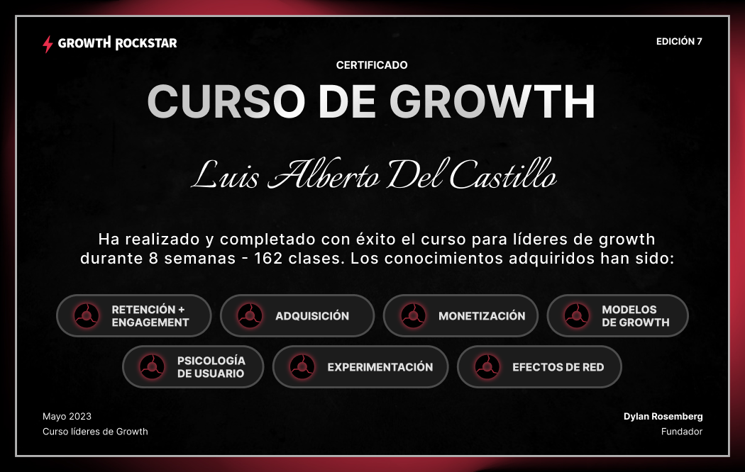 Esta página web es válida como certificado de que Luis Alberto Del Castillo ha completado el Curso de Growth de Growth Rockstar®.