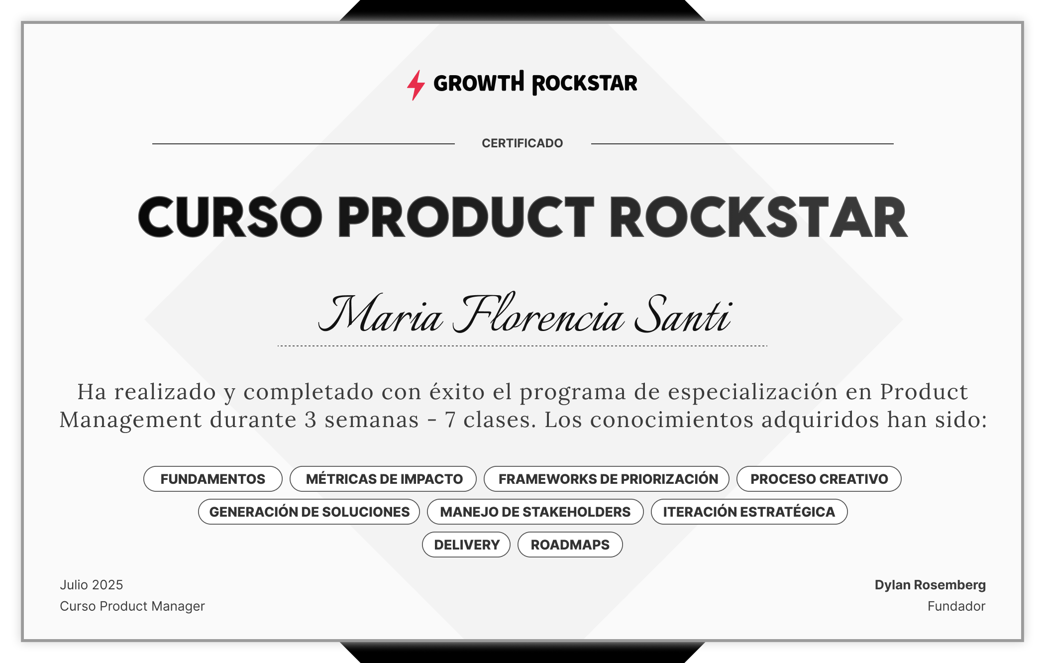 A lo largo de tres semanas de formación, Maria Florencia Santi ha completado el Curso Product Rockstar, aprendiendo a liderar el desarrollo de productos con herramientas y estrategias clave como: Fundamentos de Producto, Métricas de Impacto, Frameworks de Priorización, Proceso Creativo, Generación de Soluciones, Manejo de Stakeholders, Iteración Estratégica, Delivery y Roadmaps.