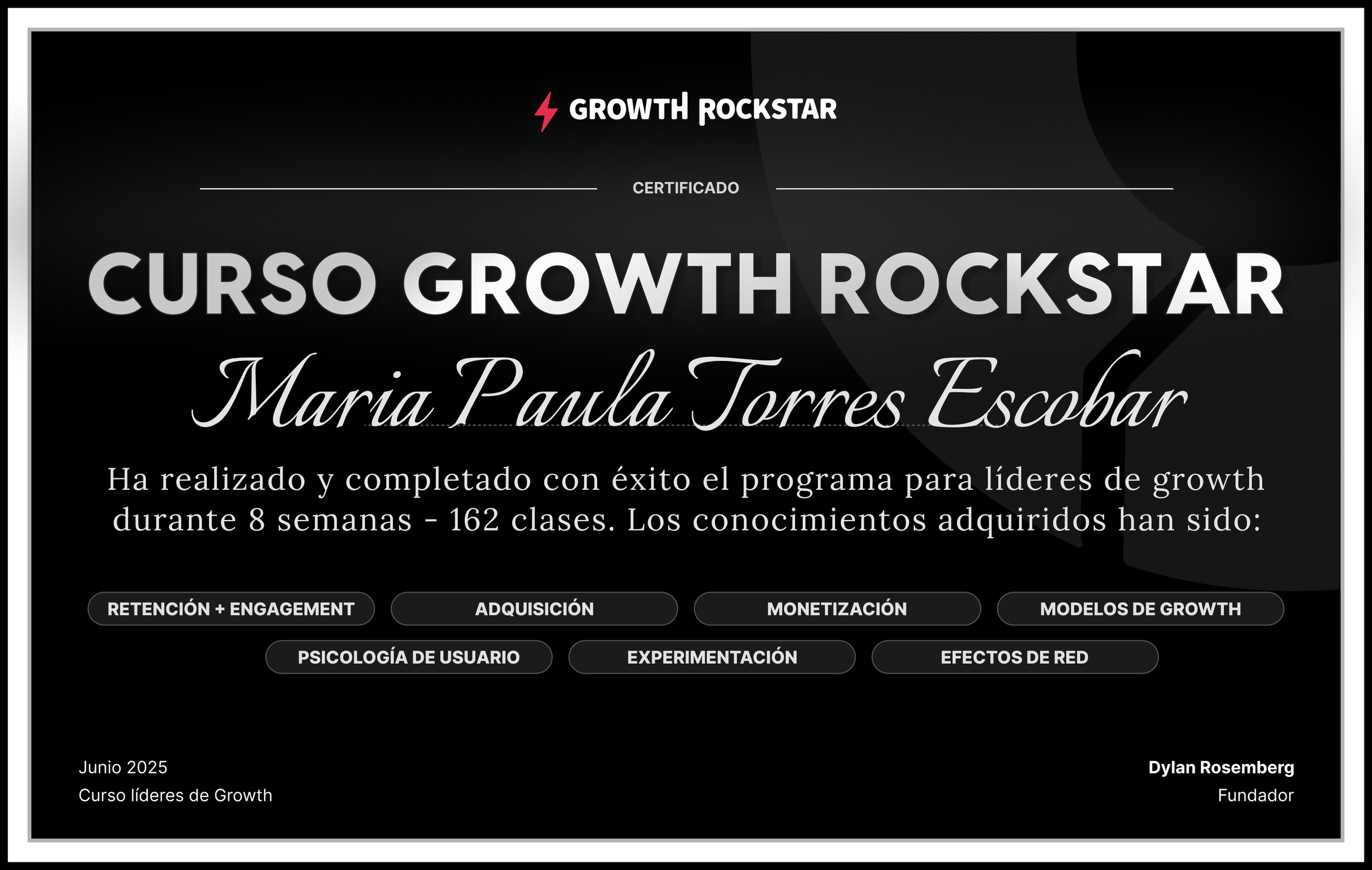 Esta página web es válida como certificado de que Maria Paula Torres Escobar ha completado el Curso de Growth de Growth Rockstar®