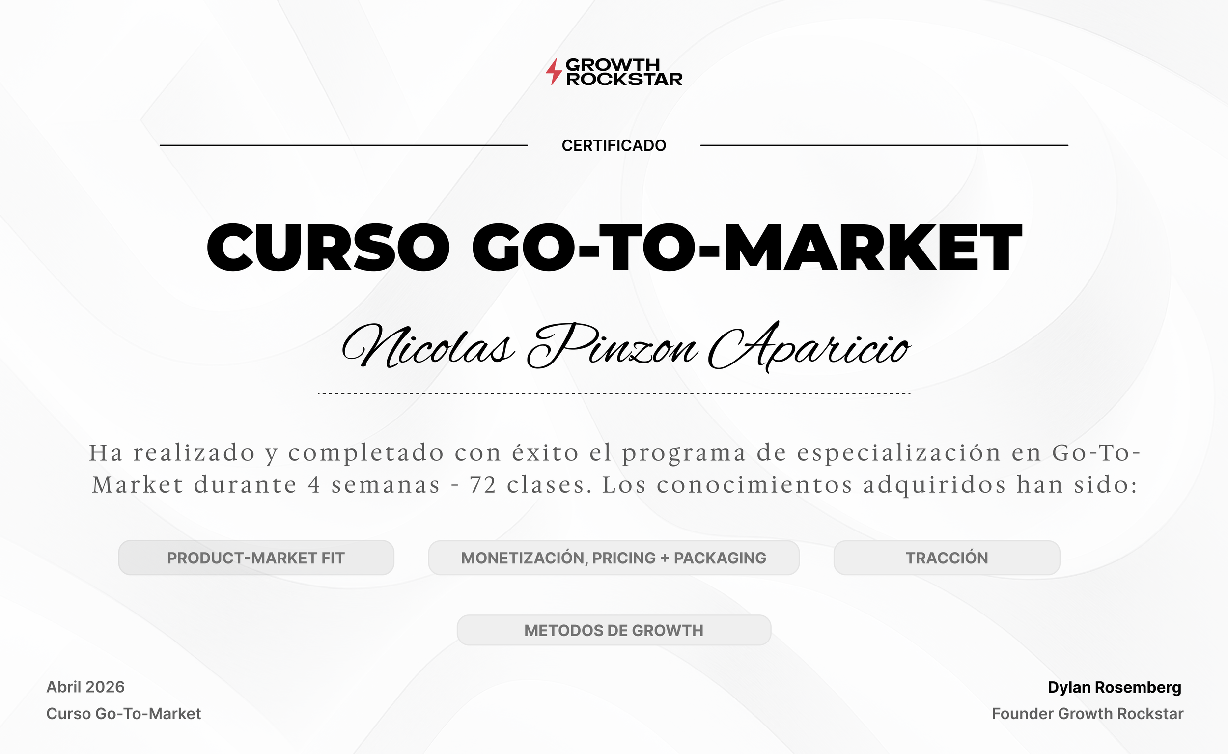 A lo largo de cuatro semanas de formación, Nicolas Pinzon Aparicio ha completado el Curso Go-To-Market, apendiendo a generar tracción con estrategias probadas de: Product-Market Fit, Monetización, Pricing + Packaging, Tracción y Métodos de Growth.