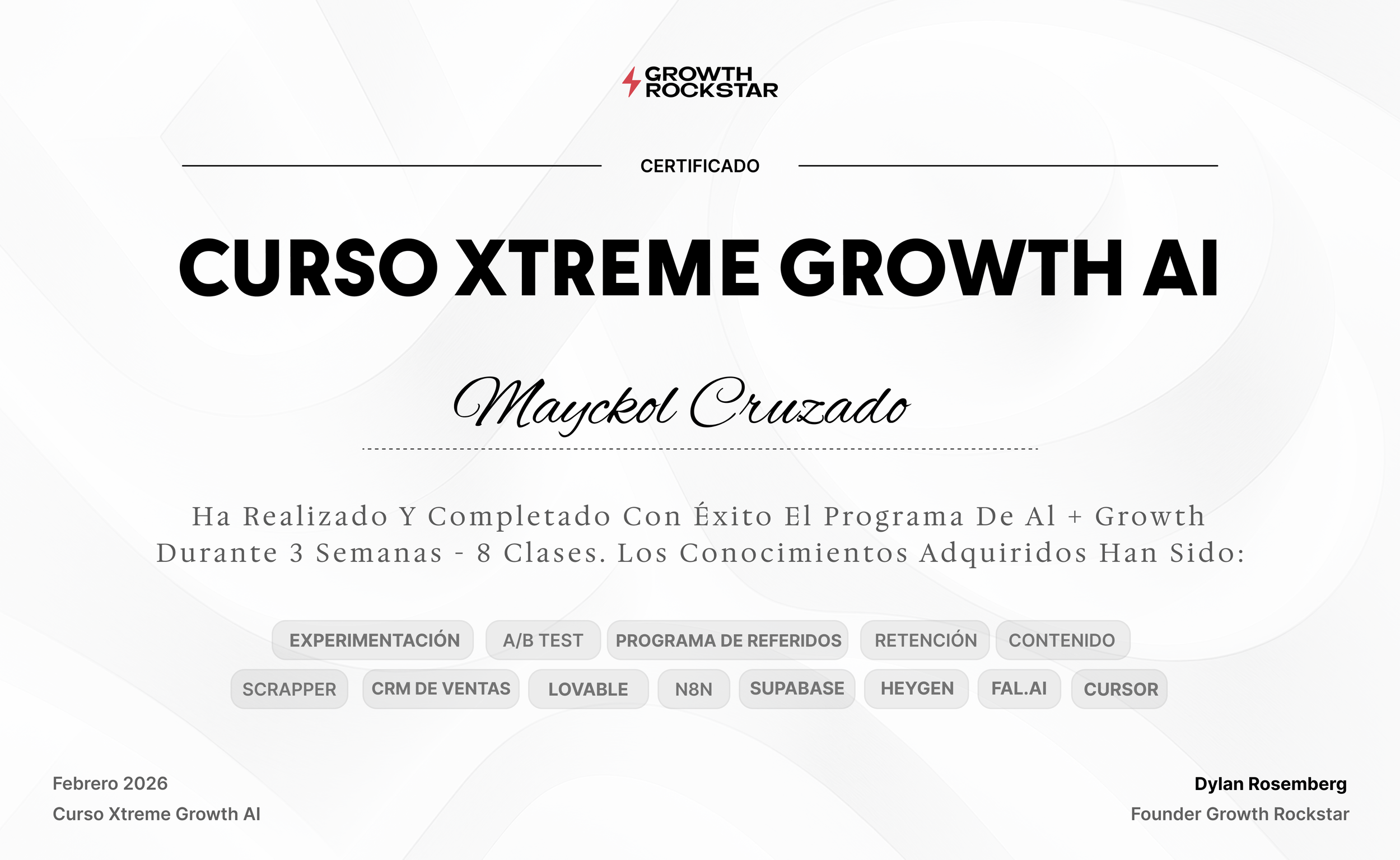A lo largo de tres semanas de formación, Mayckol Cruzado ha completado el curso de Xtreme Growth AI, desarrollando las habilidades necesarias para acelerar el crecimiento de productos y negocios a través estrategias de Growth con Inteligencia Artificial.