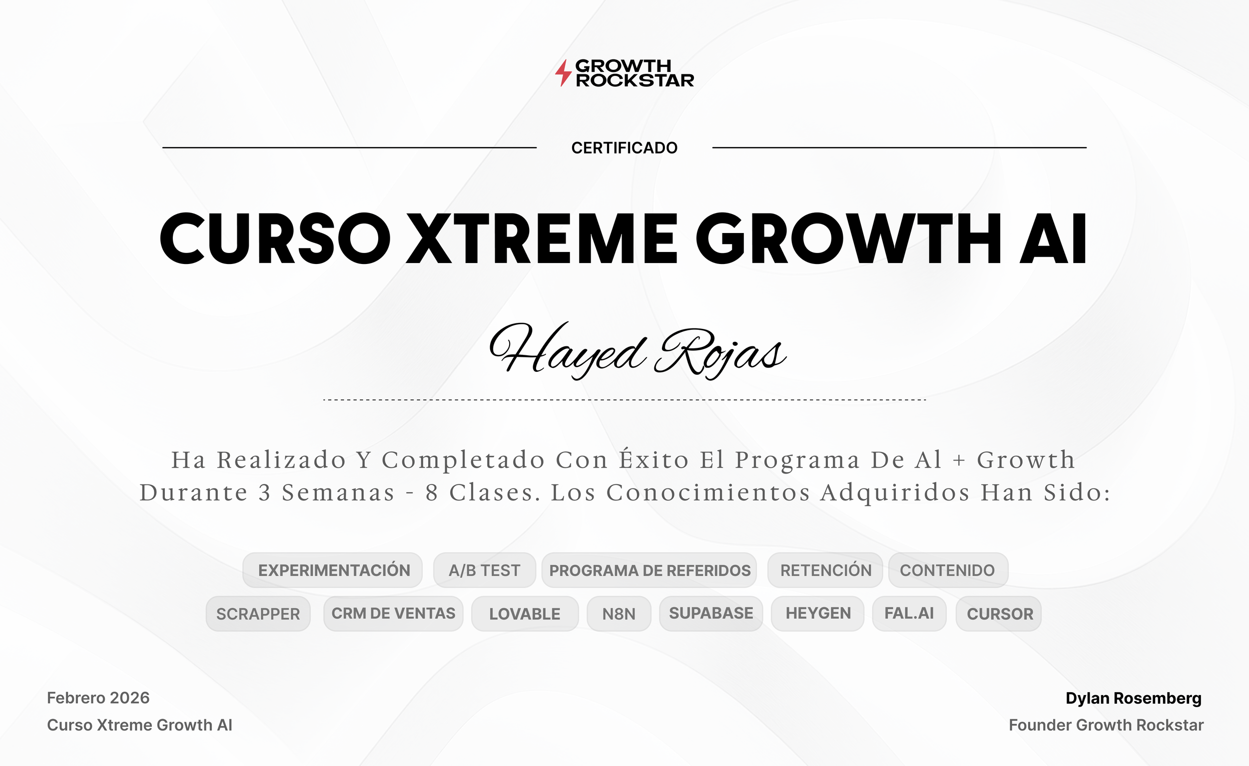 Esta página web es válida como certificado de que Hayed Rojas ha completado el Curso Xtreme Growth AI®