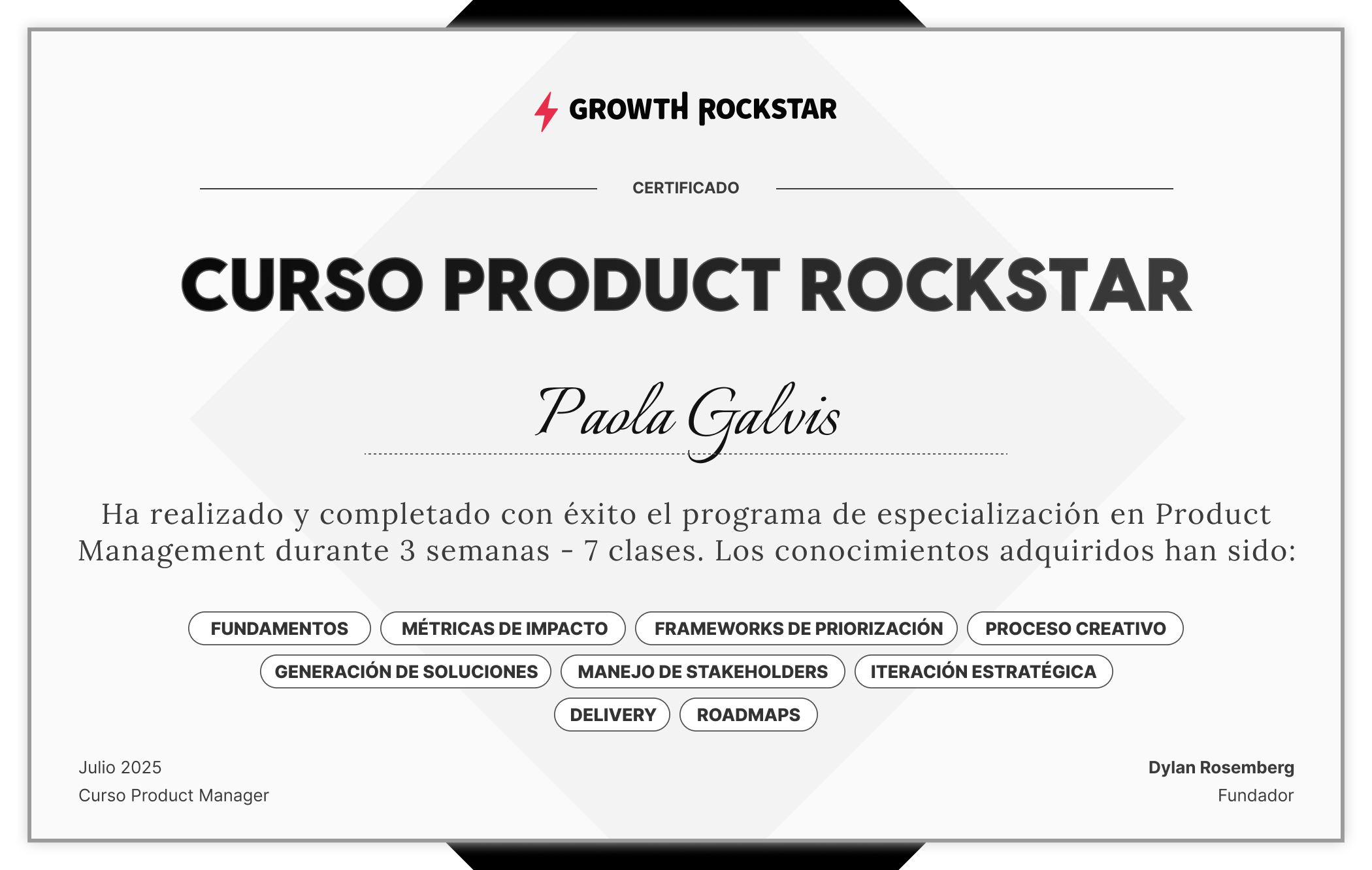 A lo largo de tres semanas de formación, Paola Galvis ha completado el Curso Product Rockstar, aprendiendo a liderar el desarrollo de productos con herramientas y estrategias clave como: Fundamentos de Producto, Métricas de Impacto, Frameworks de Priorización, Proceso Creativo, Generación de Soluciones, Manejo de Stakeholders, Iteración Estratégica, Delivery y Roadmaps.