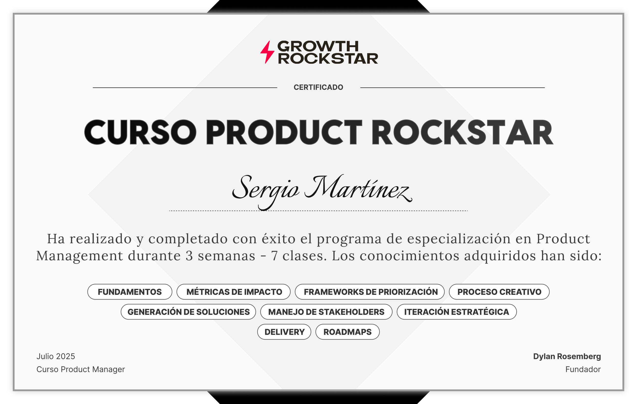 A lo largo de tres semanas de formación, Sergio Martínez ha completado el Curso Product Rockstar, aprendiendo a liderar el desarrollo de productos con herramientas y estrategias clave como: Fundamentos de Producto, Métricas de Impacto, Frameworks de Priorización, Proceso Creativo, Generación de Soluciones, Manejo de Stakeholders, Iteración Estratégica, Delivery y Roadmaps.