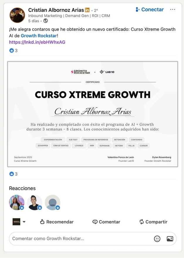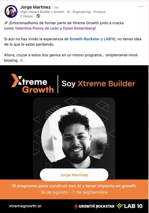 Impulsó el crecimiento de +400 empresas y ha formado a +1.100 profesionales en Latam. Fundador de Growth Rockstar, experto en construir y escalar sistemas de growth con playbooks world-class.
